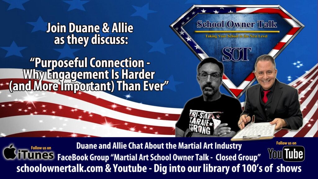 In this off-the-cuff episode, Duane Brumitt and Allie Alberigo dive into the real challenges of engaging students, parents, and staff as 2025 winds down. They get honest about the struggle to drive buy-in for events, the shifting nature of community, and why purposeful connection is more critical than ever for martial arts schools. Expect candid stories, practical strategies, and a reminder that you’re not alone in facing these hurdles.